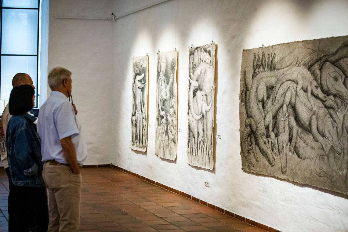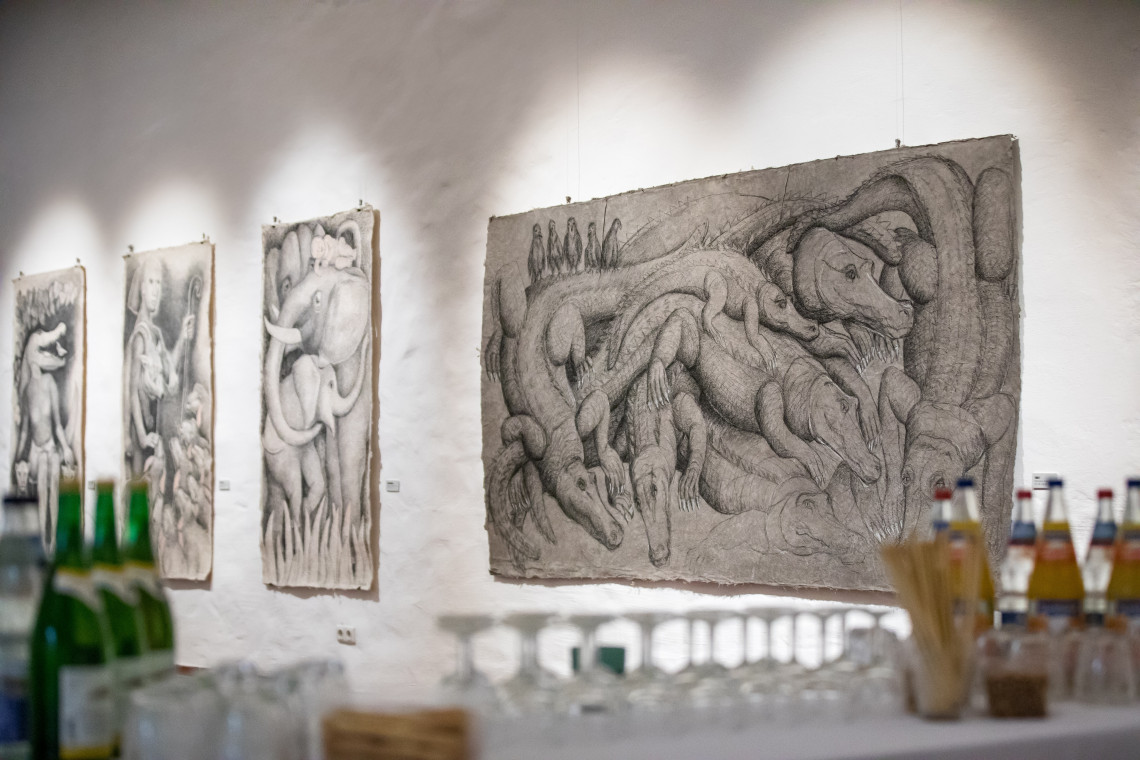 Im Inneren der Kunsthalle begegnete den Besucher:innen eine überraschend große Ruhe. Mandas großformatige Zeichnungen auf handgeschöpftem Papier – gearbeitet mit Graphit und Kreide – ließen an traumartige Verbindungen denken. Es eröffneten sich intime Szenen mit exotischen Tieren, hybriden Wesen und mythisch anmutenden Figuren. Ihre Darstellungen wirkten gleichermaßen physisch präsent wie rätselhaft entrückt. In ihnen offenbart sich eine fragile Kraft, ein Naturgesetz jenseits des Rationalen, das sich dem Betrachter intuitiv mitteilt.