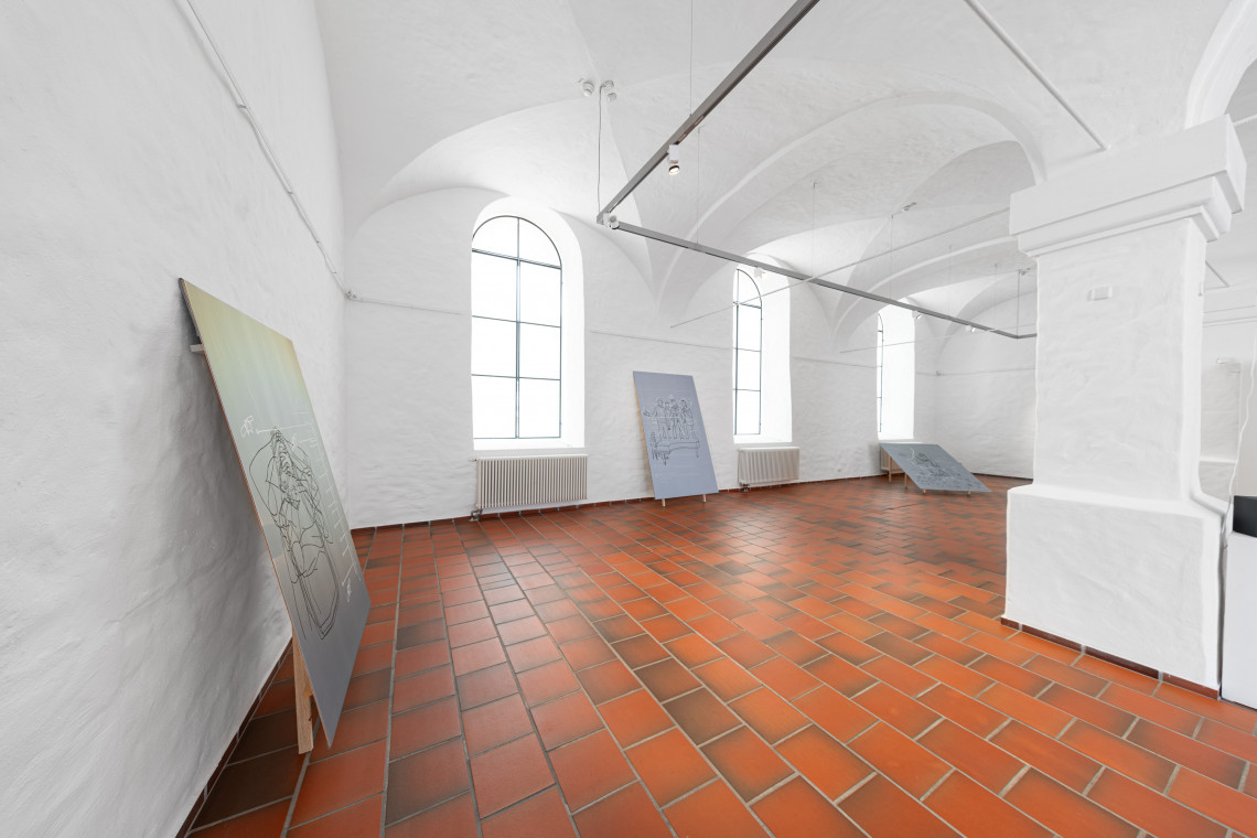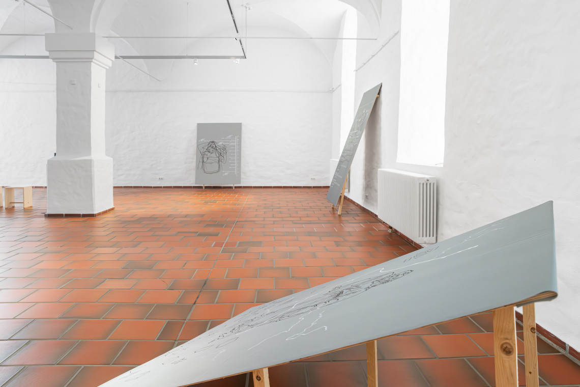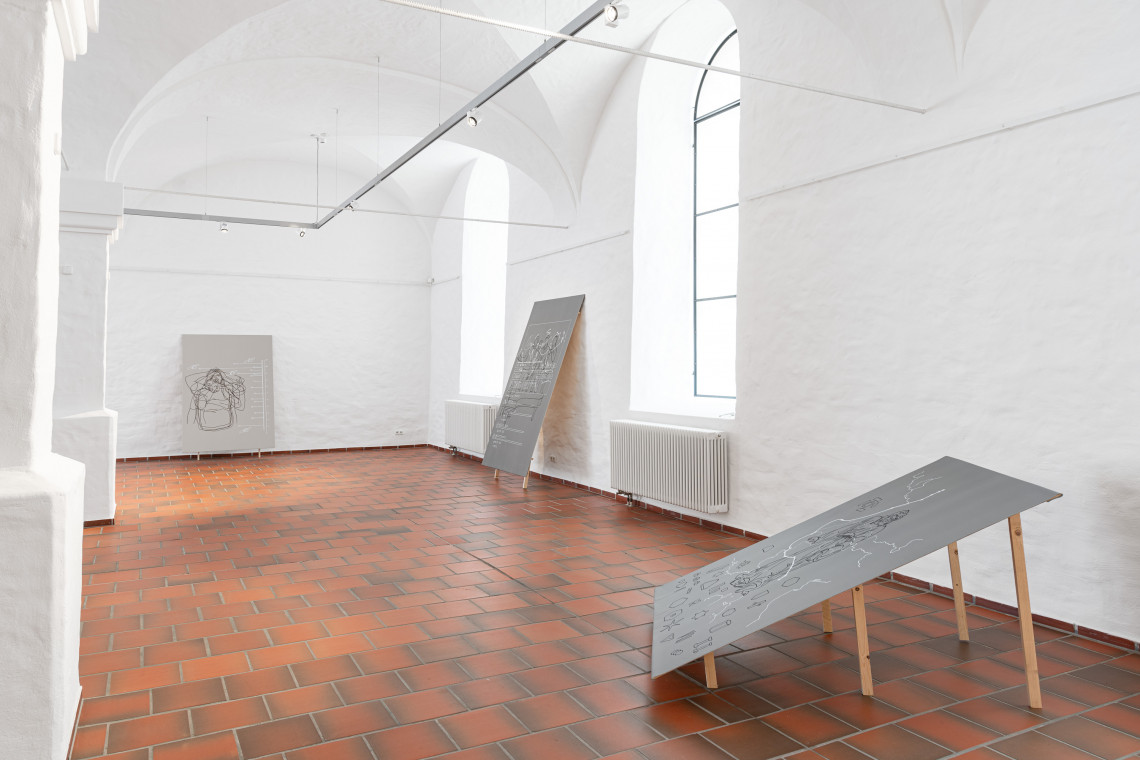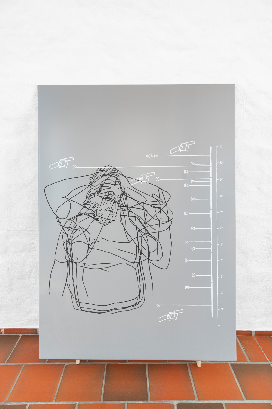 Neben der Videoarbeit werden großformatige Zeichnungen präsentiert, die in einer schematische Erkundungen das Thema visualisieren.