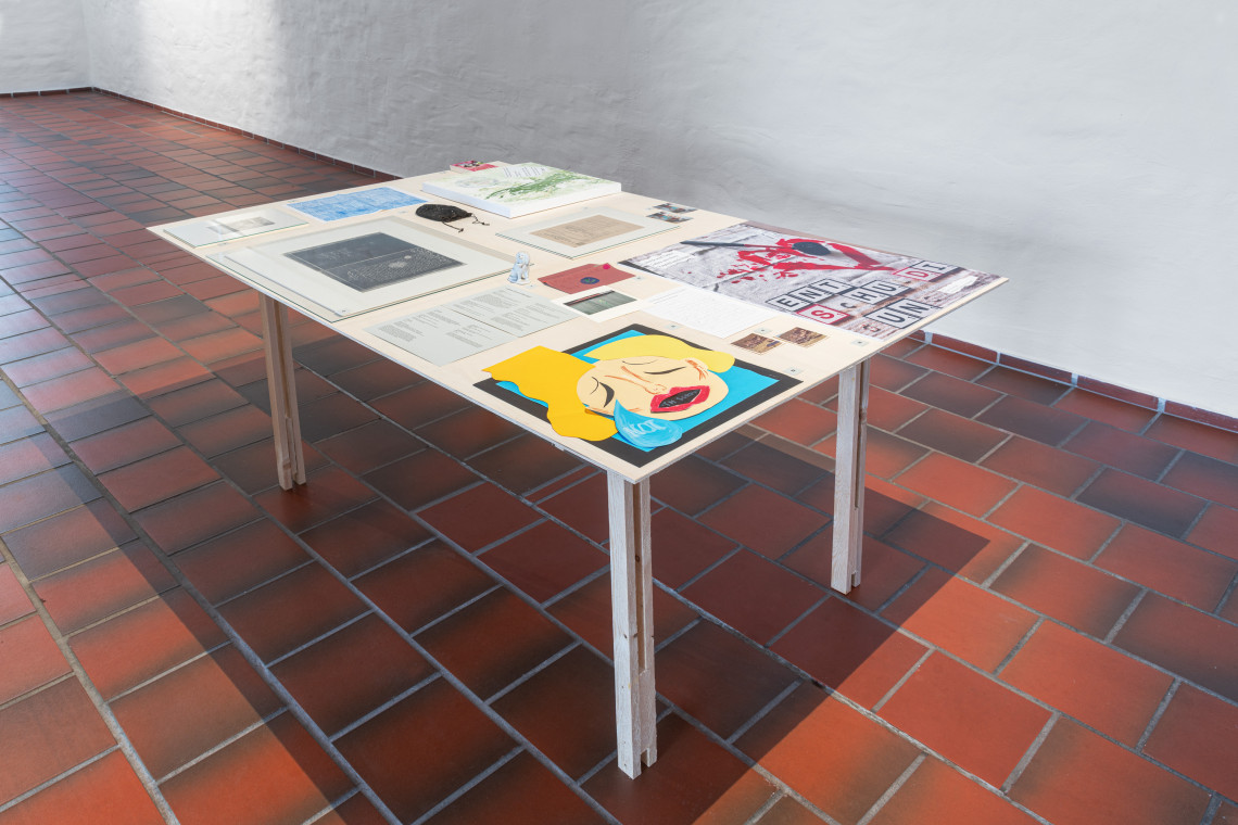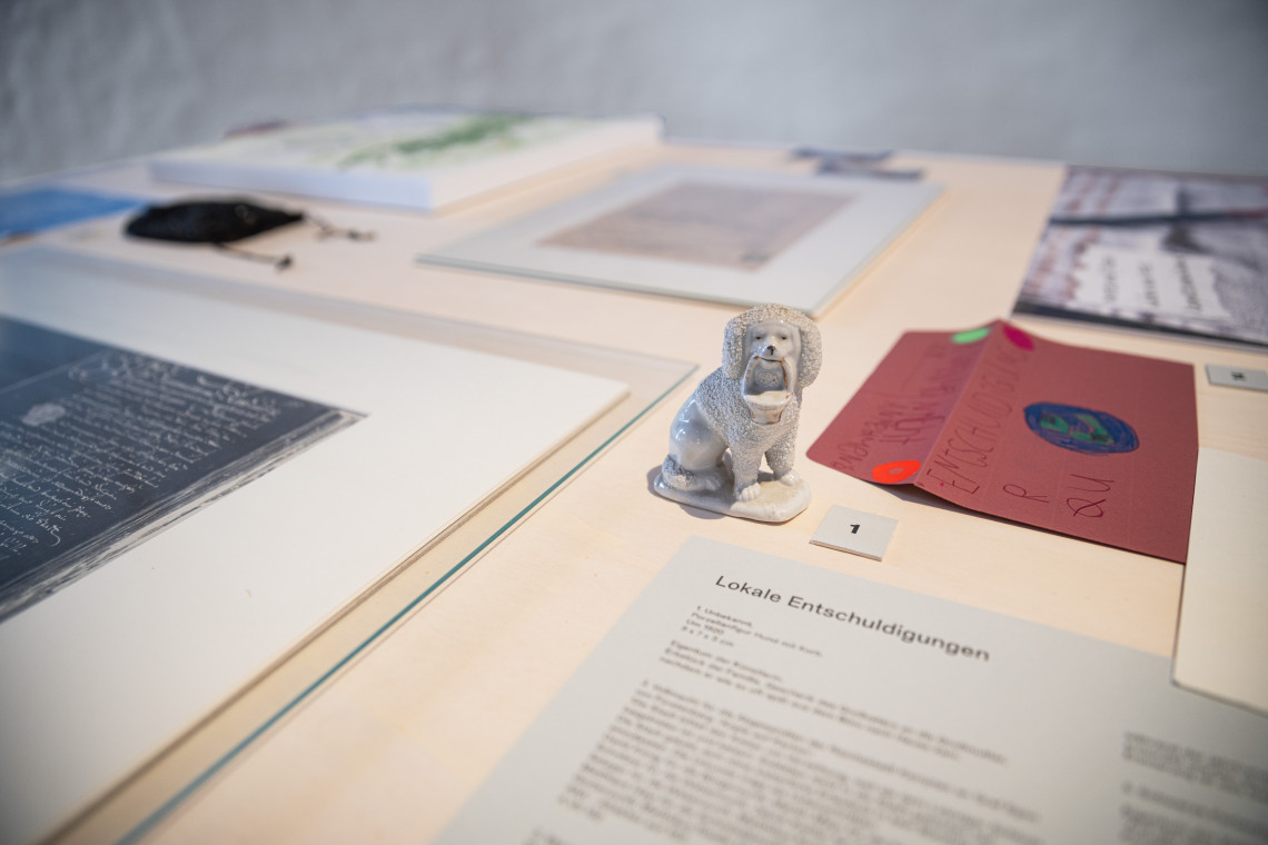 Der dritte Aspekt der Ausstellung ist eine Sammlung historischer, lokaler und persönlicher Dokumente, Briefe, und Anekdoten, die die Künstlerin während ihrer Recherchen in Kempten gesammelt hat.