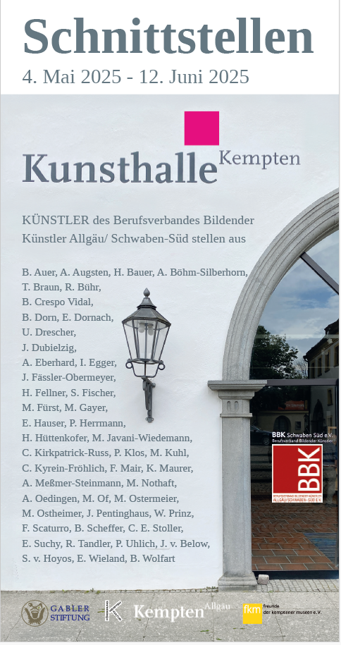 Künstler:innen des BBK Allgäu/Schwaben-Süd widmen sich in dieser Gruppenausstellung dem Thema "Schnittstellen" und kombinieren durch abstrakte Formen, Farbverläufe, Symbolik, Figuren und Portrait, Collagetechnik, Landschaften der verschiedenen Elemente, dynamische Kompositionen oder Textur und Material.