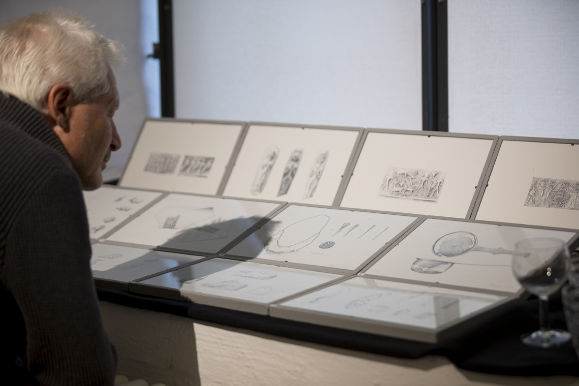 Einen weiteren Ausstellungsschwerpunkt bildeten Mandas archäologische Zeichnungen – Freilegungen anderer Art, die sie während zahlreicher Grabungsaufträge angefertigt hat. Es sind detailgetreue und maßstabsgerechte Abbildungen lange im Sand verborgener Zeugnisse der Vergangenheit.